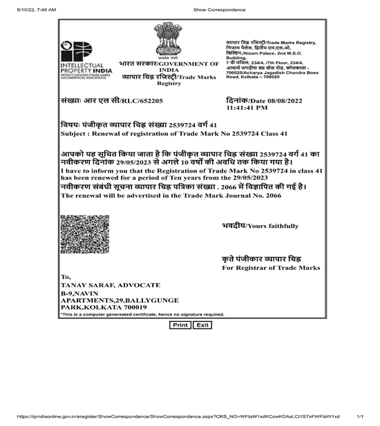 Trade Mark Certificate Renewal 2023-2033(Government of INDIA)